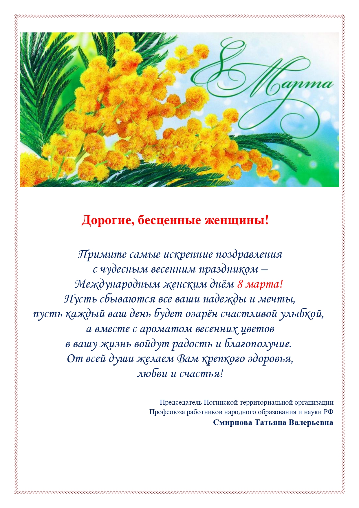 Уважаемые коллеги!!! Ногинская территориальная организация Общероссийского Профсоюза образованияпоздравляет Васс праздником –Днём Учителя! Желаем процветания,творческих успехов, послушных и талантливых учеников,достойной оплаты труда и полной реализации в любимом деле! Хорошего настроения, активной жизненной позиции , крепкого здоровьяи мира! Будьте счастливы! С уважением, Председатель ТК Профсоюза Татьяна Валерьевна Смирнова.